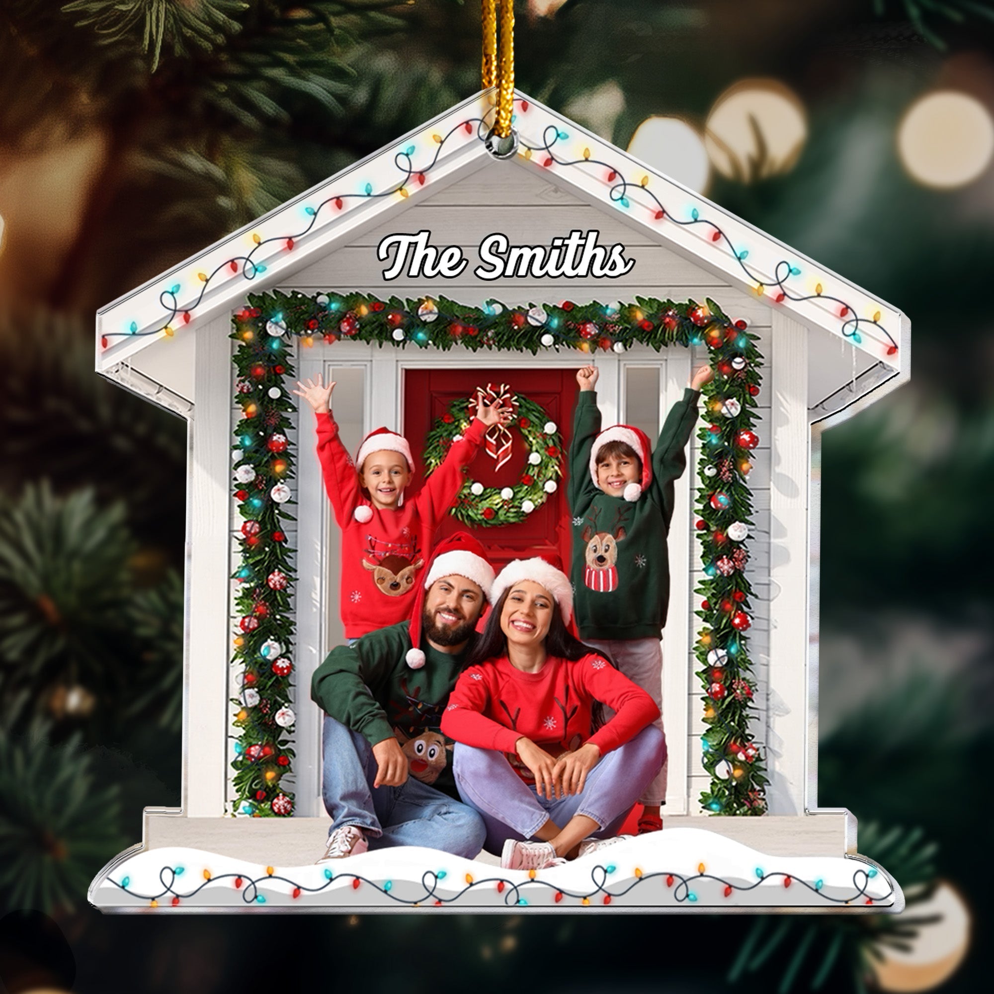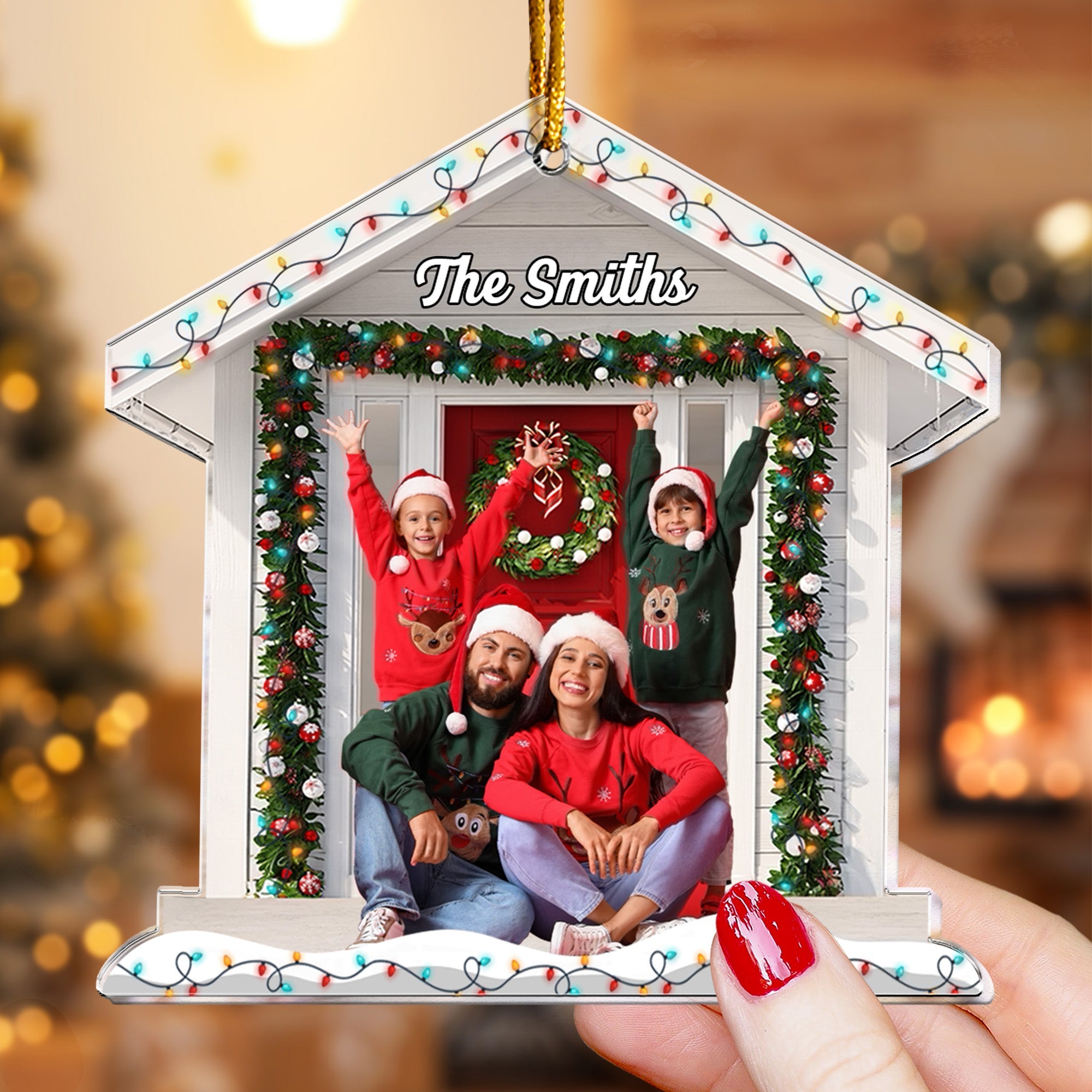 These acrylic photo ornaments are shaped like houses to celebrate the first Christmas in your new home.