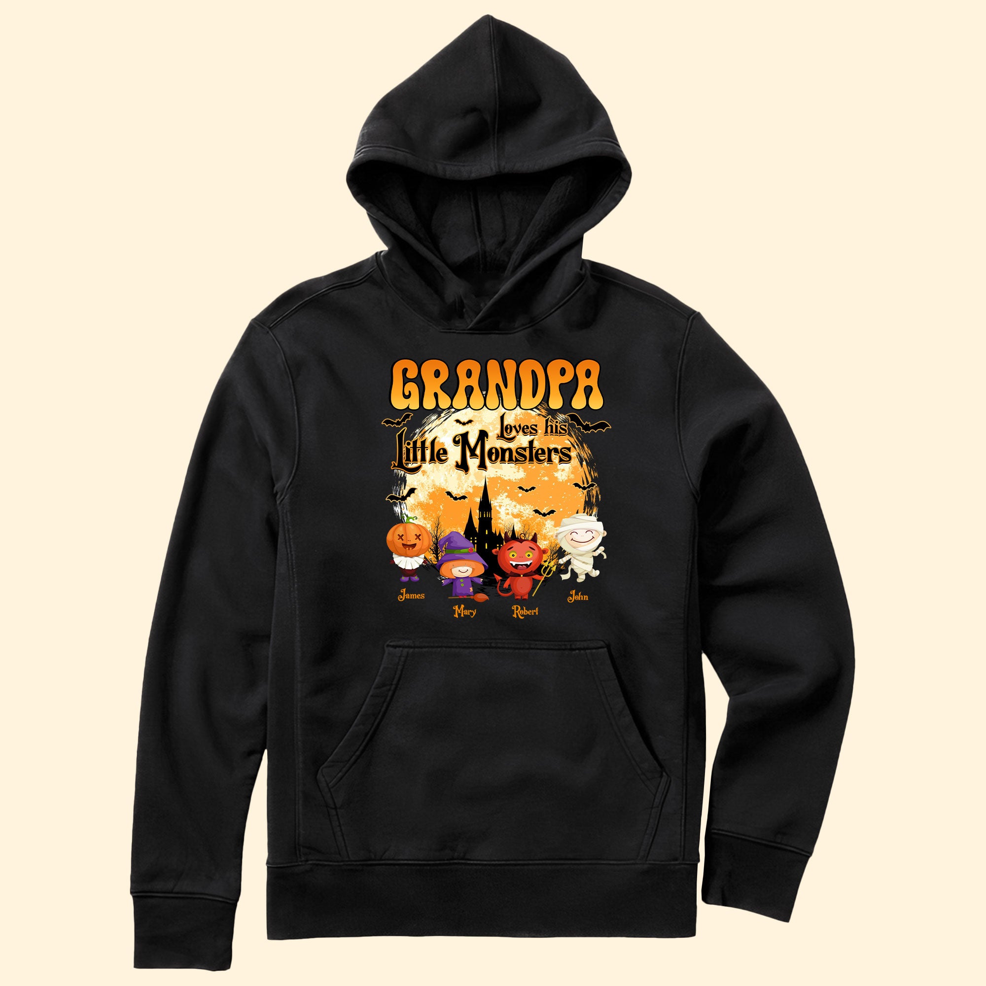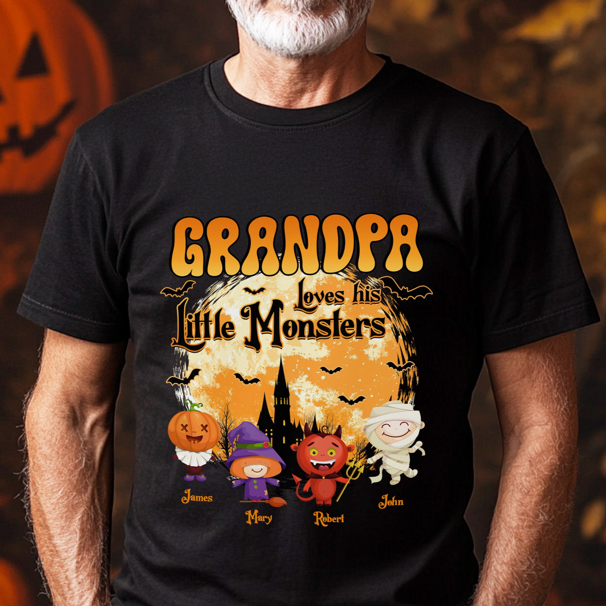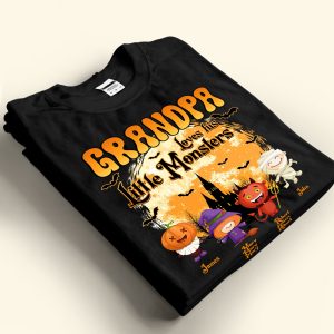 Crafted from soft, comfortable fabric, this shirt is perfect for wearing during Halloween festivities or any day of the year. The playful design showcases each grandchild as a cute little monster, adding a fun and personalized touch that Grandpa will cherish.