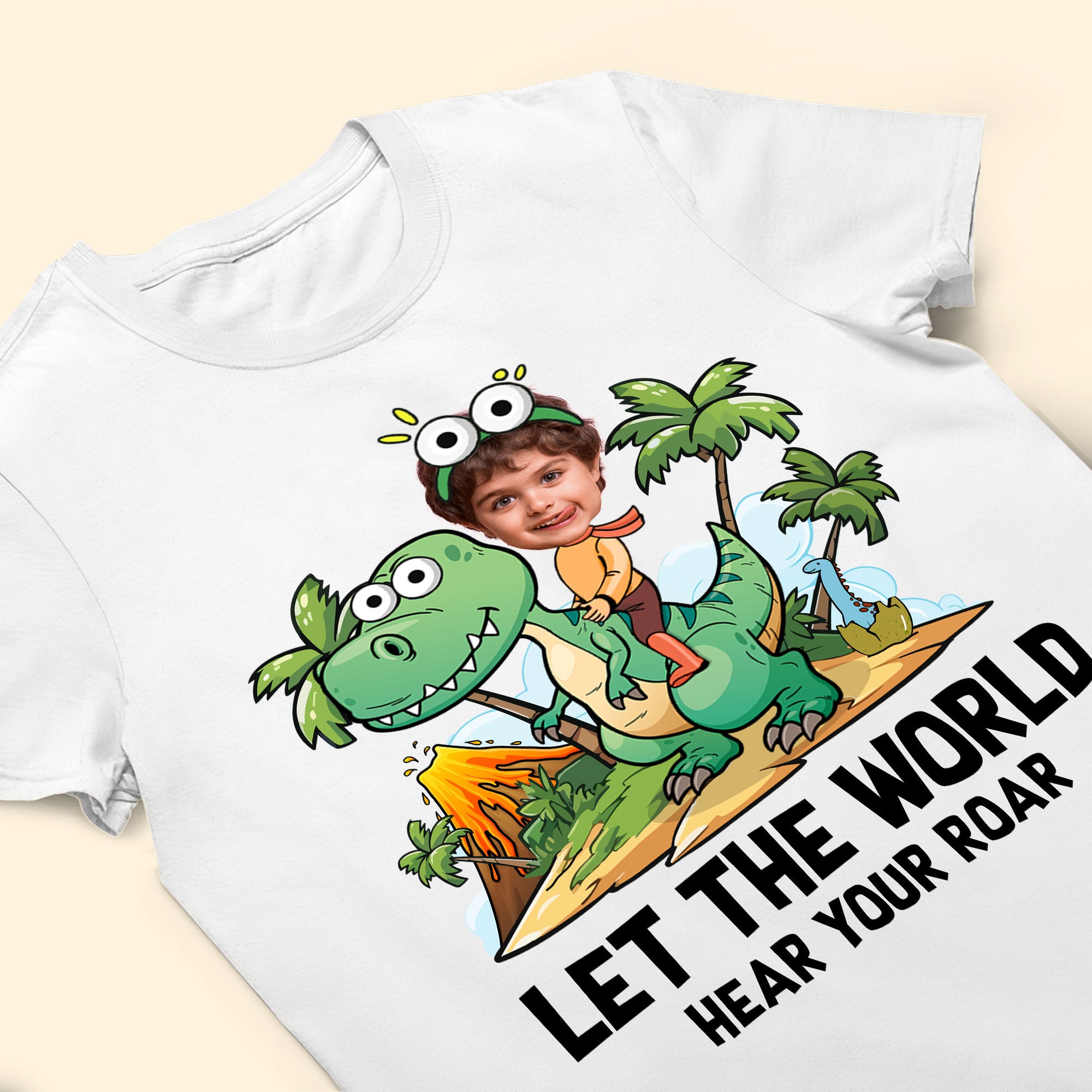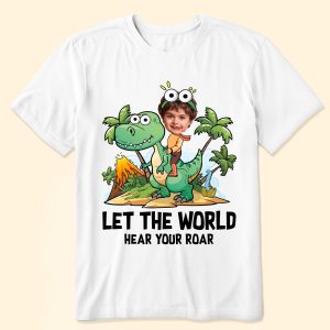 Unleash your child’s inner dinosaur lover with our ‘Let The World Hear Your Roar’ Cute Dinosaur Kid Shirt. This personalized photo shirt is perfect for kids who adore dinosaurs and love to make a statement.