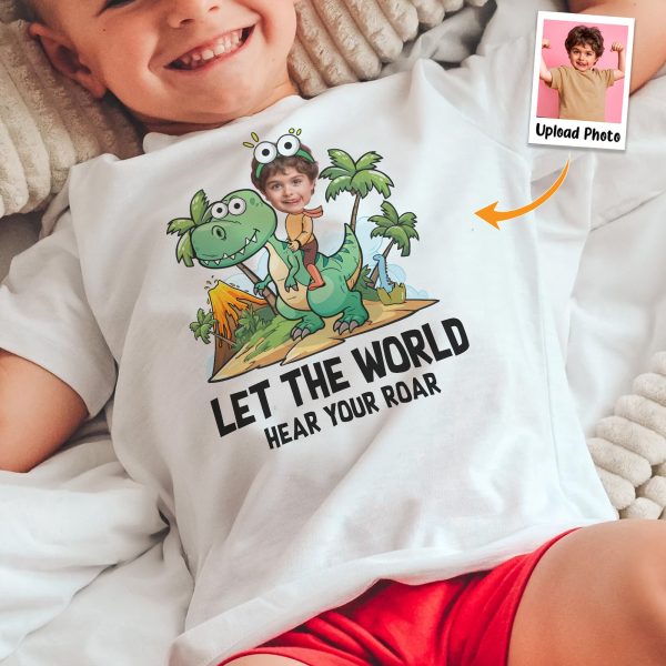 Unleash your child’s inner dinosaur lover with our ‘Let The World Hear Your Roar’ Cute Dinosaur Kid Shirt. This personalized photo shirt is perfect for kids who adore dinosaurs and love to make a statement.
